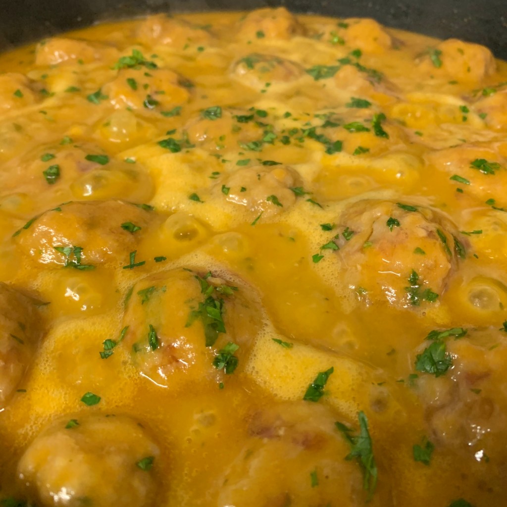 Incorporamos las albóndigas que tendremos a un fuego suave durante 20’. Les vamos dando la vuelta de vez en cuando.