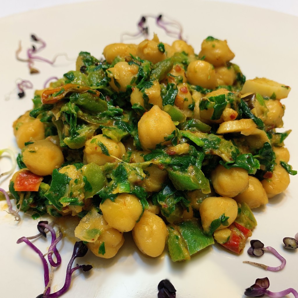 🔹Cuando las espinacas han reducido su tamaño a la mitad, echamos los garbanzos que ya tenemos cocidos y los ajos laminados que habíamos retirado, y mezclamos bien todos los ingredientes para que se integren todos los sabores.