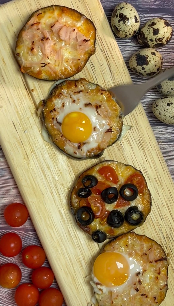🔹Ahora solamente falta montar las pizzas. Ponemos tomate natural en cada rodaja, se coloca queso mozarella u otro queso que queramos. Después ponemos los ingredientes que queramos. Yo he puesto un poco de tomate, unas aceitunas, un poco que pechuga de pavo y unos huevos de codorniz.